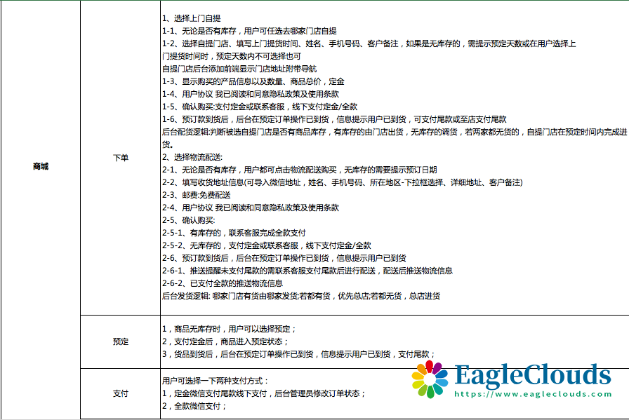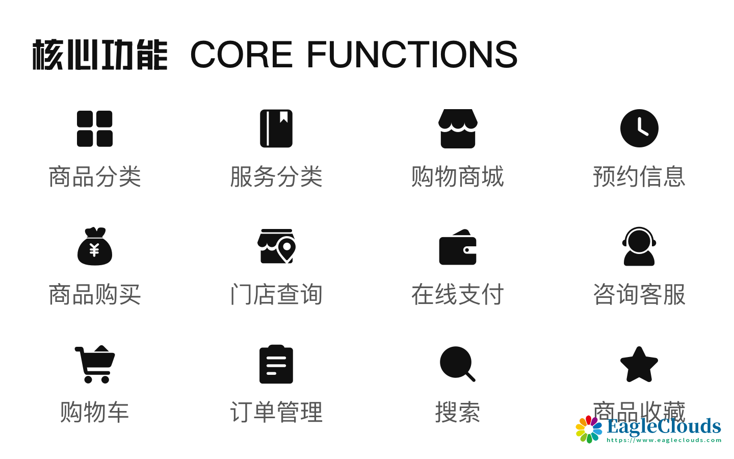 商品分类、商品购买、服务分类、门店查询、购物商城、在线支付、预约信息、咨询客服、购物车、订单管理、商品收藏。