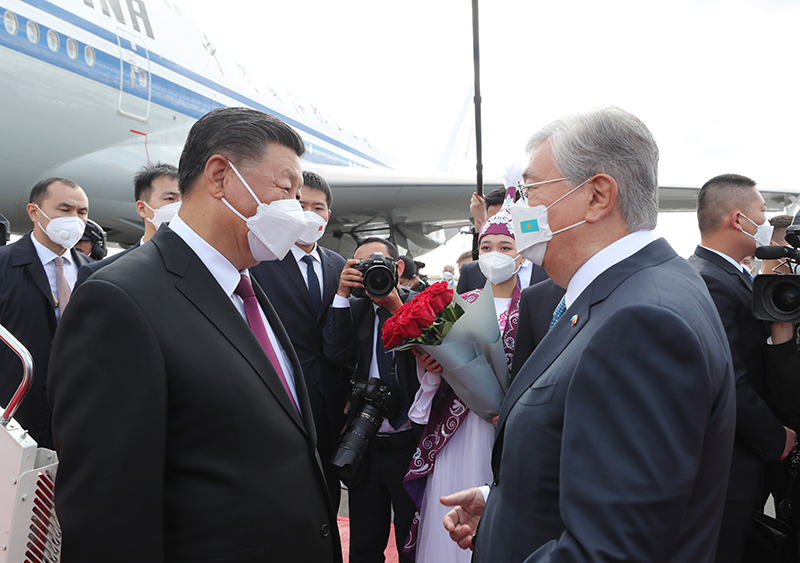 哈萨克斯坦总统托卡耶夫率政府副总理兼外长特列乌别尔季、努尔苏丹市市长库里吉诺夫等高级官员在机场热情迎接。70余名礼兵分列两侧致敬,军乐团奏迎宾号角。两名盛装哈萨克斯坦女青年手捧鲜花,表达对习近平主席的热烈欢迎。