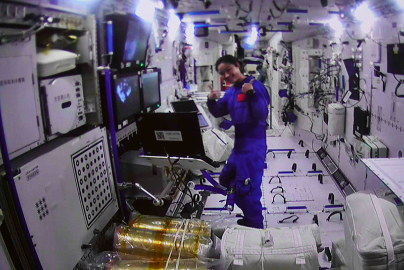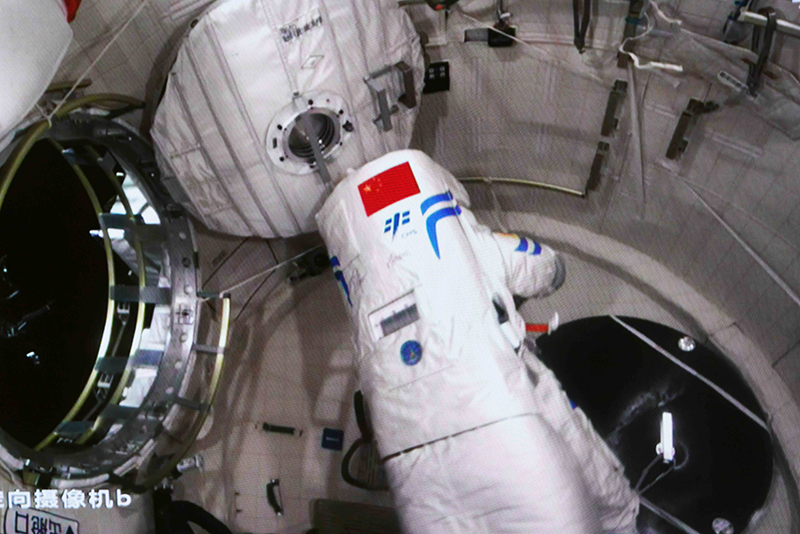 9月17日在北京航天飞行控制中心拍摄的神舟十四号航天员陈冬结束出舱任务返回问天实验舱的画面。