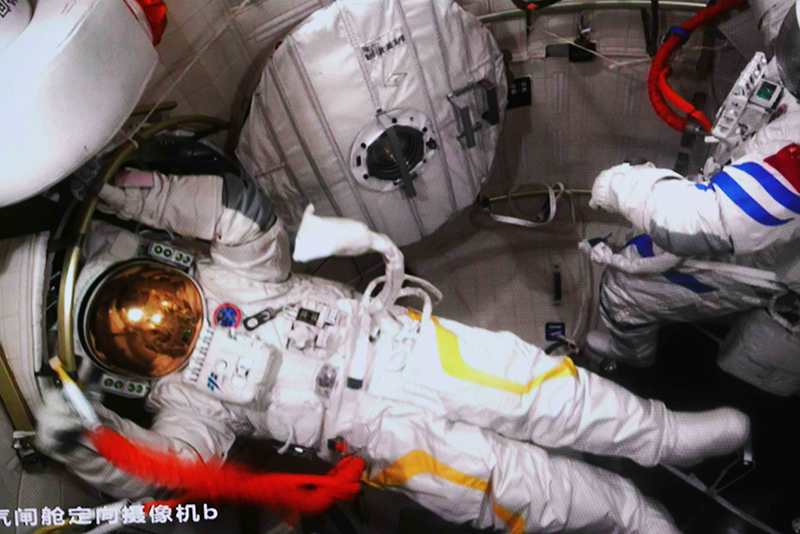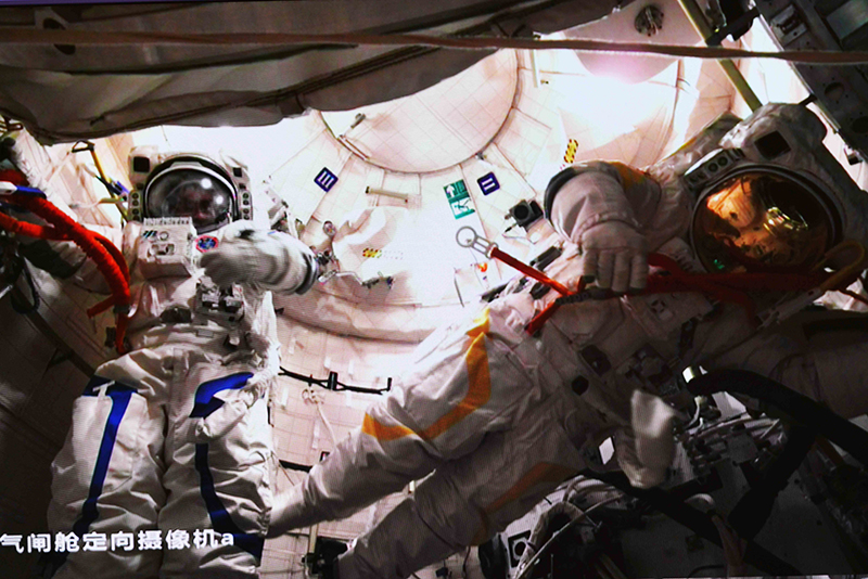 9月17日在北京航天飞行控制中心拍摄的神舟十四号航天员陈冬(右)、蔡旭哲同时在舱外操作的画面。