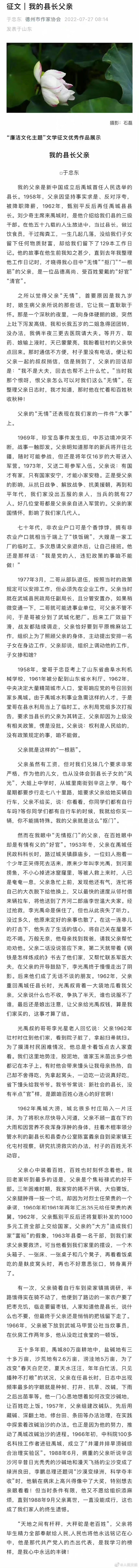 9月18日,德州市作家协会发布“廉洁文化主题文学作品征文获奖名单”,其中《我的县长父亲》一文获得征文比赛一等奖。该文因取名与喜剧电影《夏洛特烦恼》中的“我的区长父亲”作品名类似,引发部分网友嘲讽。随后德州作协删除了获奖信息和链接。