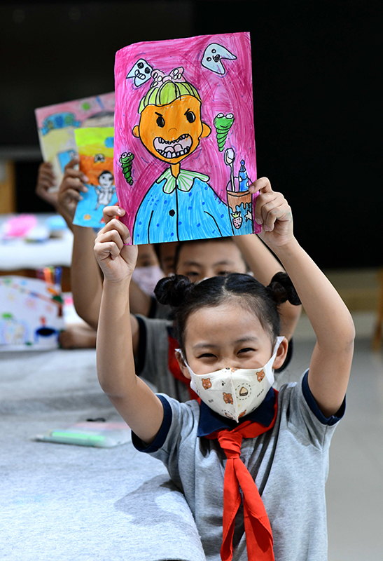 9月19日,在河北省石家庄市西古城小学,孩子们在展示迎接爱牙日主题绘画作品。