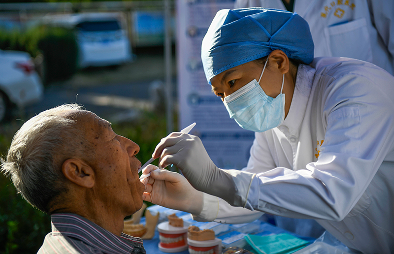 9月19日,医生在河北省遵化市兴旺寨镇何家峪村为村民检查牙齿。