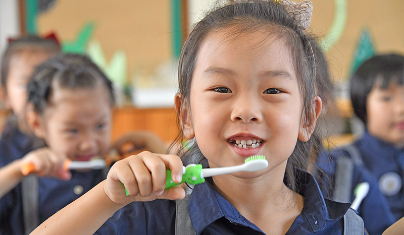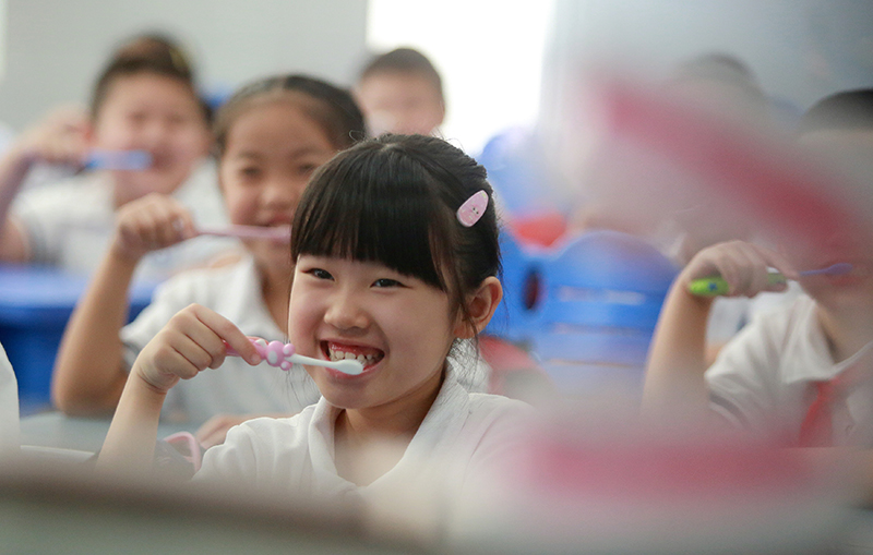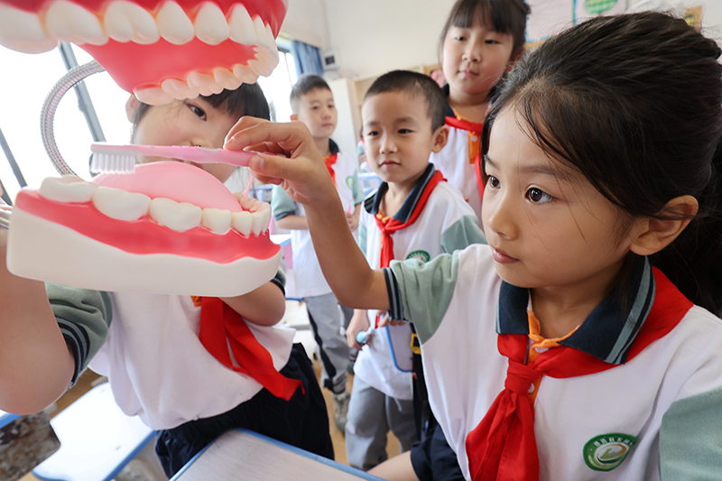9月19日,在江苏省扬州市朱自清小学,学生在老师指导下练习正确的刷牙方法。