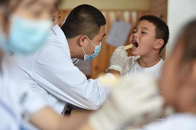 9月19日,河北省石家庄市井陉县医院口腔科医生为小朋友进行牙齿检查。