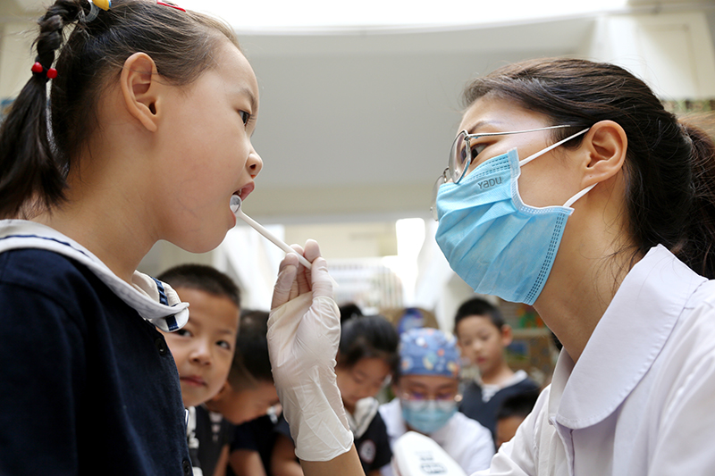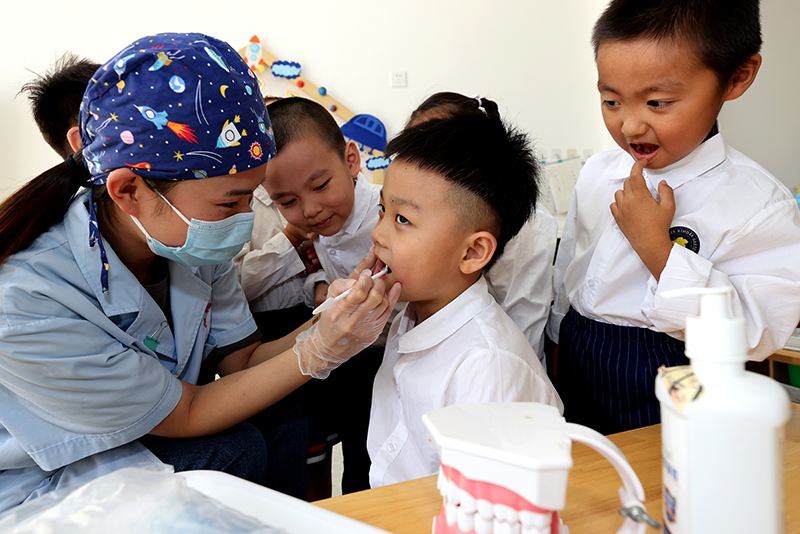 9月19日,在山东省枣庄市薛城区兴安花园幼儿园,医护人员在为小朋友检查口腔健康状况。