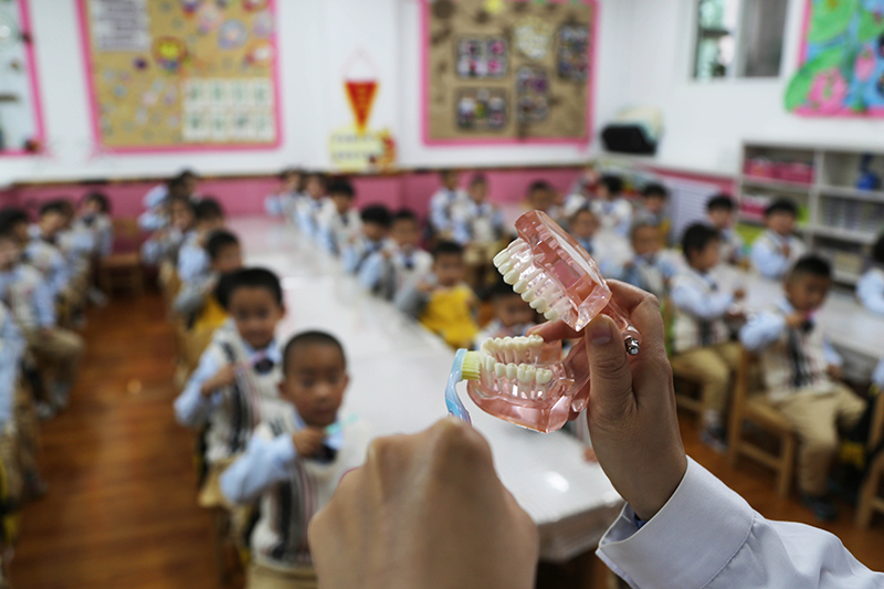 9月19日,在河北省石家庄市井陉矿区横涧乡天护幼儿园,医务人员为孩子们讲解牙齿保健知识和正确的刷牙方式。