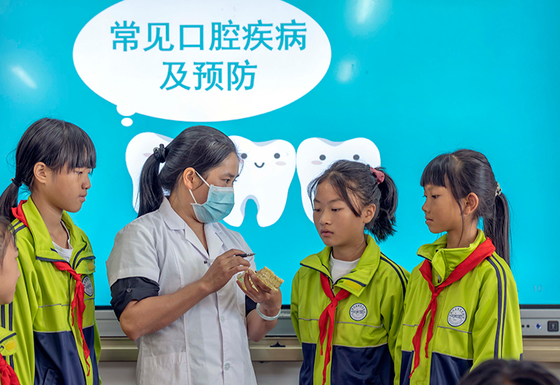 9月19日,医生在贵州省黔西市锦绣学校给学生讲解爱牙护齿知识。
