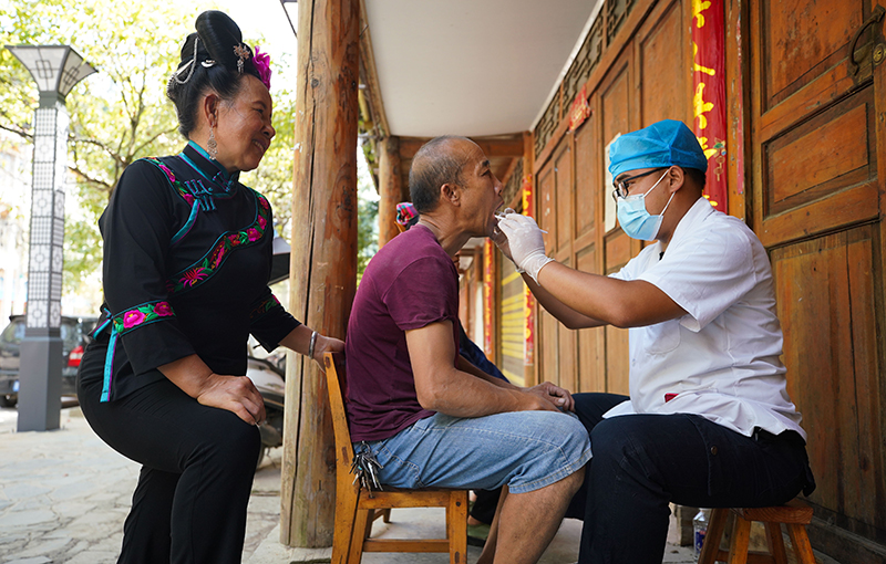 9月19日,村医张震在贵州省黔东南苗族侗族自治州丹寨县排调镇排调村为村民检查牙齿。