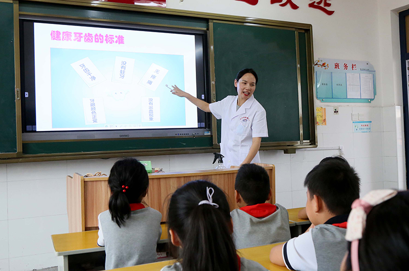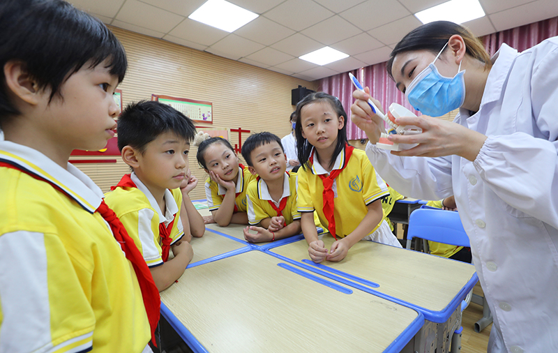 9月19日,河南省洛阳市汝阳县疾控中心工作人员给县外国语小学学生普及口腔健康知识。
