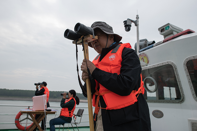 9月23日,科考人员在湖北石首水域进行观测工作。