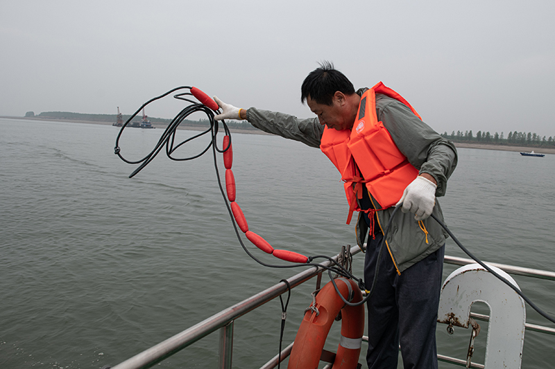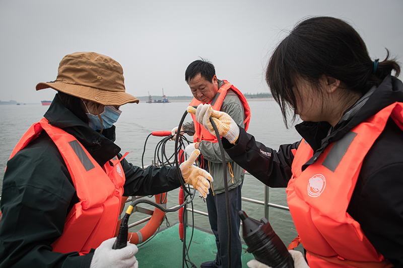9月23日,科考人员在湖北石首水域通过微型声信号记录仪进行探测工作。