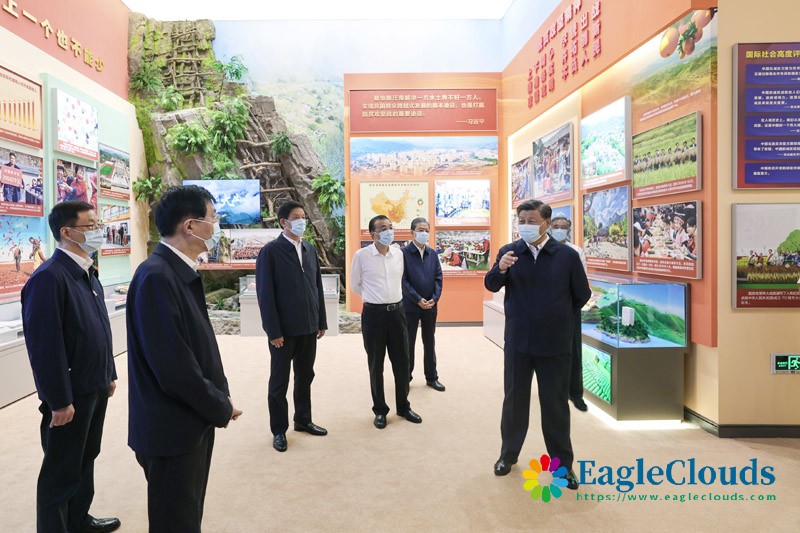 展示我国科技水平和制造能力跃升的自主研发关键产品实物、模型,反映功勋荣誉表彰体系日益丰富完备的勋章、奖章,国家级重大出版项目《复兴文库》,生动再现脱贫攻坚和抗击新冠肺炎疫情历史进程的实物、图表、图片,“五基”协同天空地一体化生态环境立体遥感监测体系模拟沙盘,武器装备模型,呈现总体国家安全观深刻内涵、党内法规制度建设成果的展板、实物,彰显京津冀协同发展成就的立体电子地图,展现规划建设、轨道交通和科技创新等方面亮点成果的粤港澳大湾区沙盘……一件件实物模型、一段段生动视频、一幅幅图片图表,吸引了习近平等领导同志的目光。他们不时驻足观看,听取讲解,询问有关情况。