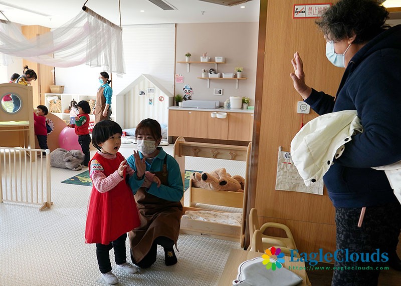在江宁路街道社区综合为老服务中心的“宝宝屋”,小朋友与外婆挥手说再见(2022年3月7日摄)。
