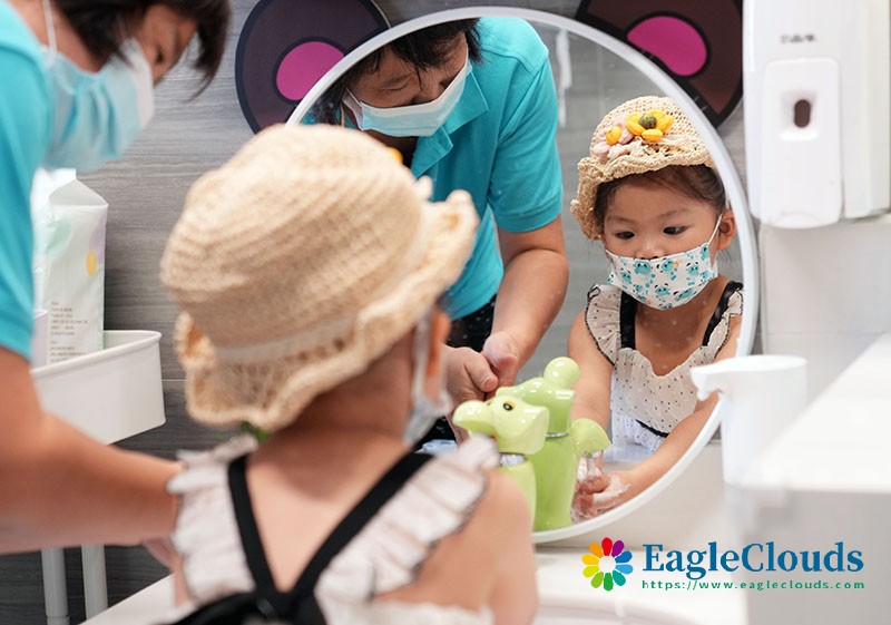 9月27日,在江宁路街道社区党群服务中心内的“宝宝屋”,看护人员在指导小朋友洗手。