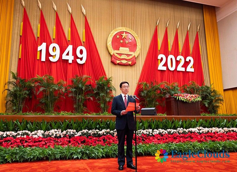 人民大会堂宴会厅华灯璀璨、鲜花绽放,洋溢着喜庆热烈的节日气氛。主席台上方,庄严的国徽高悬,“1949-2022”的大字年号在鲜艳的红旗映衬下格外醒目。