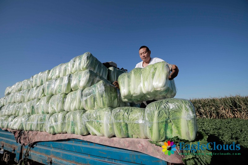 10月10日,河北省玉田县虹桥镇的农民将收获的白菜装车外运。