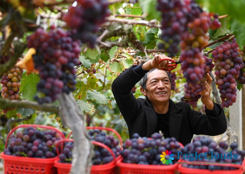 10月10日,农民在贵州省黔东南苗族侗族自治州凯里市三棵树镇采摘葡萄。