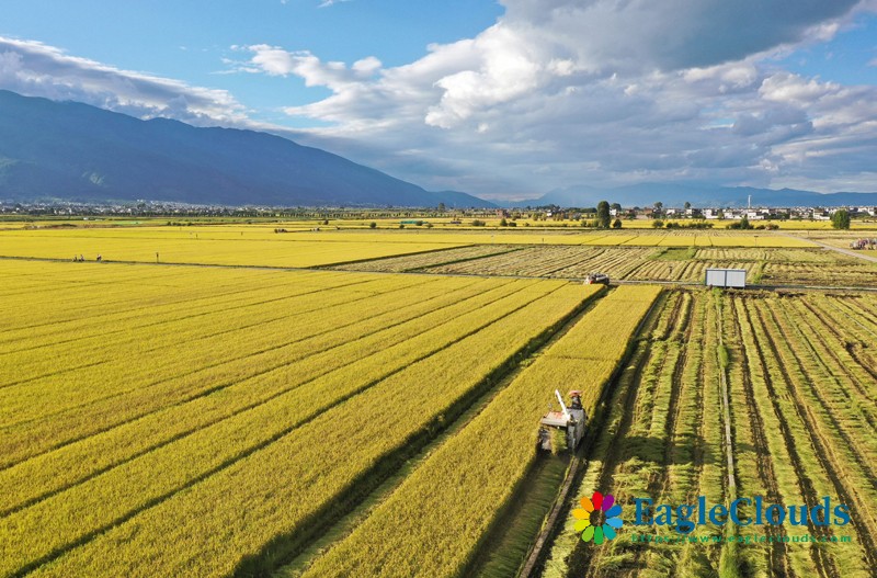 10月8日,在云南省大理白族自治州大理市湾桥镇,农机手在收获水稻(无人机照片)。
