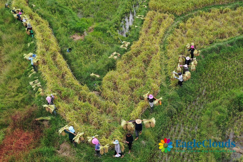 10月10日,在贵州省黔东南苗族侗族自治州从江县刚边壮族乡平正村,村民挑运刚收获的糯稻谷(无人机照片)。