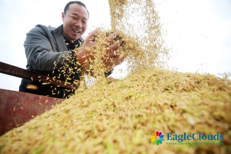 10月9日,在江苏省仪征市陈集镇友好村,农民在收获水稻。