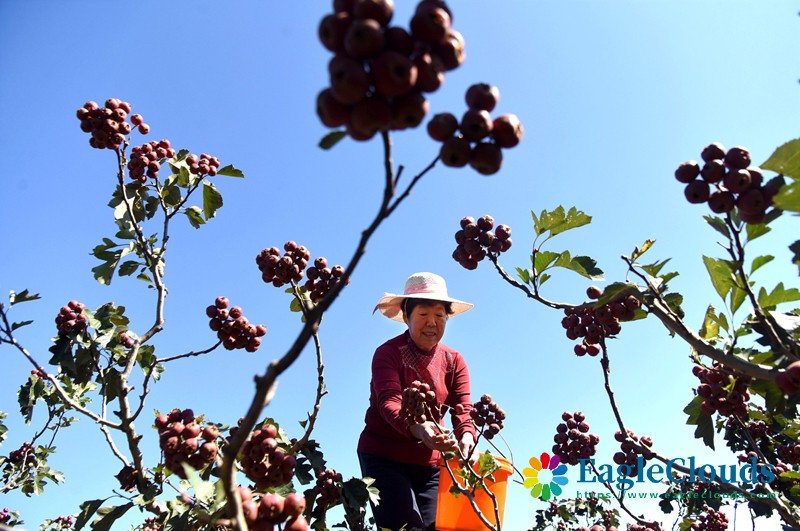 10月10日,山东省淄博市沂源县悦庄镇崔家庄村的农民在采摘山楂。