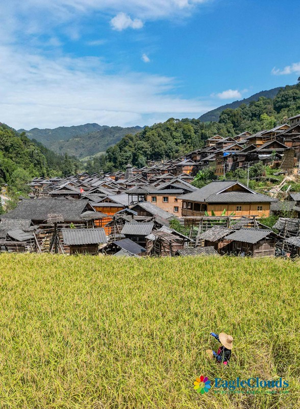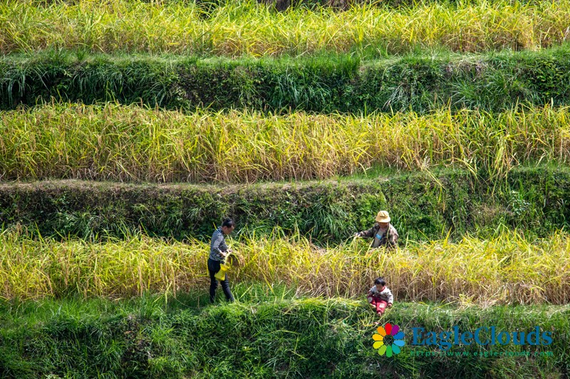 10月10日,贵州省黔东南苗族侗族自治州从江县丙妹镇岜沙村的村民用传统方式收割糯稻谷。