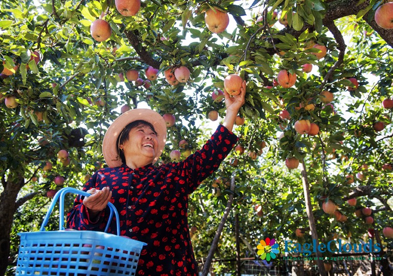 10月8日,山东省胶州市洋河镇曲家炉村的村民在果园里采收苹果。
