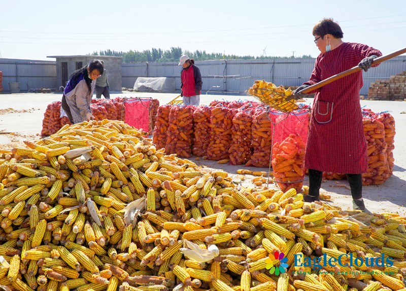 10月10日,在山东省菏泽市定陶区黄店镇,村民将收获的玉米进行晾晒。