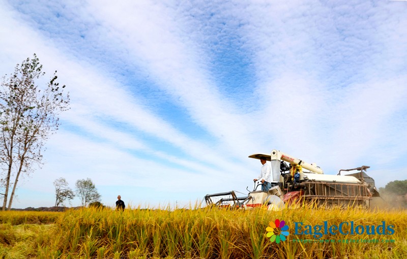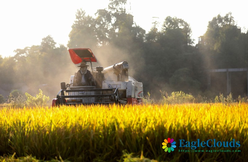 10月10日,在湖南省衡阳市祁东县河洲镇,农机手驾驶农机在收割稻谷。