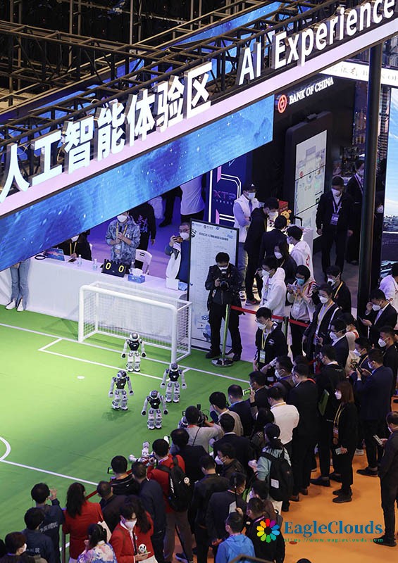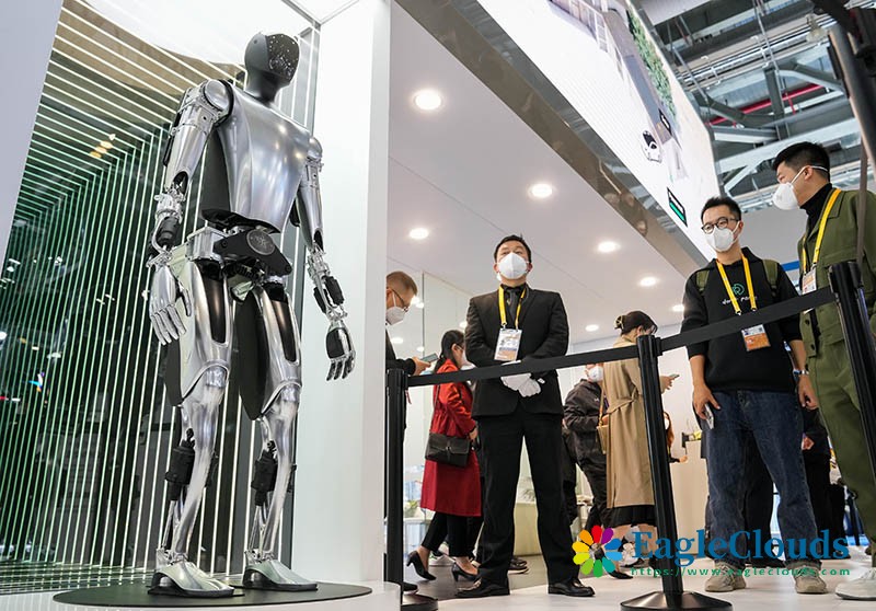 11月5日,参观者在第五届进博会人工智能专区观看机器人表演。