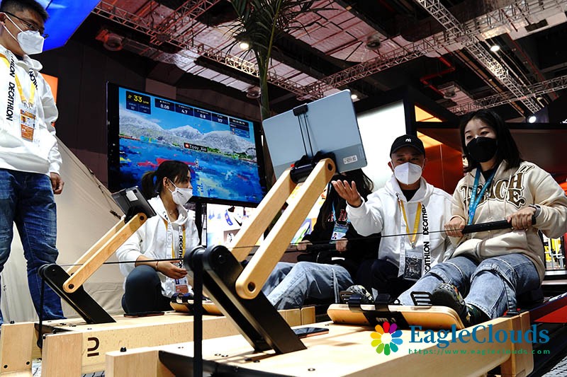 11月5日,参观者在第五届进博会的消费品展区体验“划船机”。