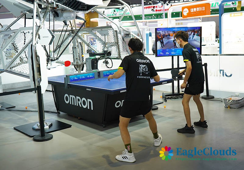 这是11月5日在第五届进博会技术装备展区欧姆龙展台拍摄的乒乓球教练机器人设备。