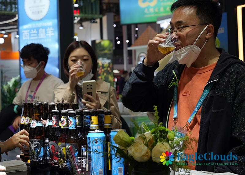 11月5日,观众在第五届进博会食品及农产品展区品尝精酿啤酒。