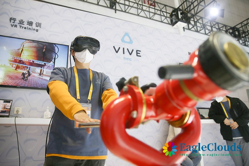 11月5日,工作人员在第五届进博会技术装备展区展示VR行业培训设备。