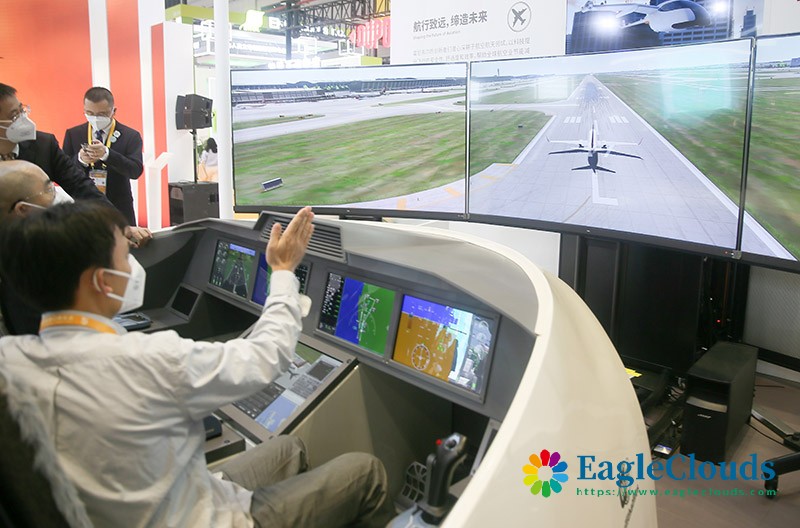 11月5日,在第五届进博会技术装备展区霍尼韦尔展台,参观者在工作人员指导下体验模拟飞行。