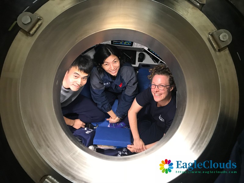 11月4日,在中国“探索一号”科考船上,中科院深海所潜航员邓玉清(中)、袁鑫(左)和新西兰国家水资源和大气研究所科研人员卡琳·施纳贝尔准备进行万米深潜。