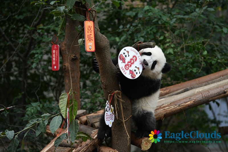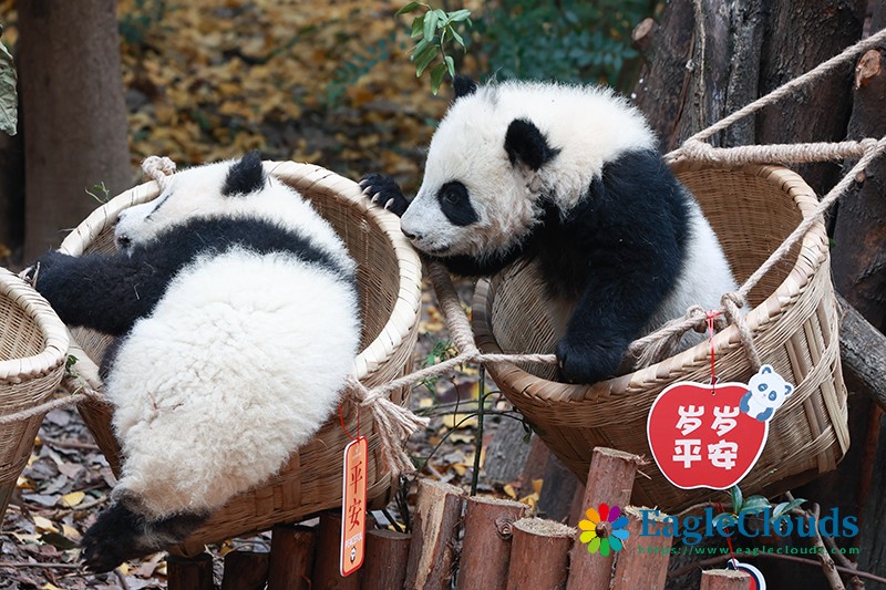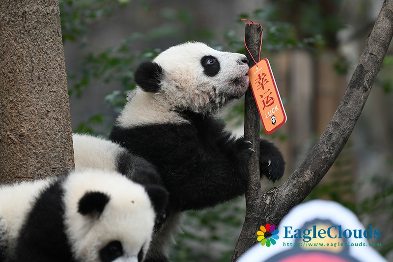 元旦将至,成都大熊猫繁育研究基地内13只2022年新生大熊猫宝宝集体亮相,为游客们送上新年祝福。
