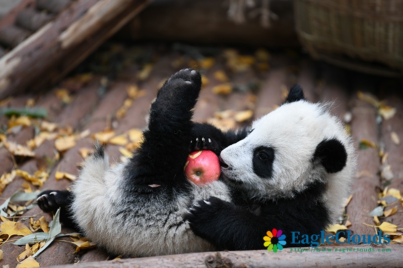 12月29日,在成都大熊猫繁育研究基地,大熊猫宝宝在吃苹果。
