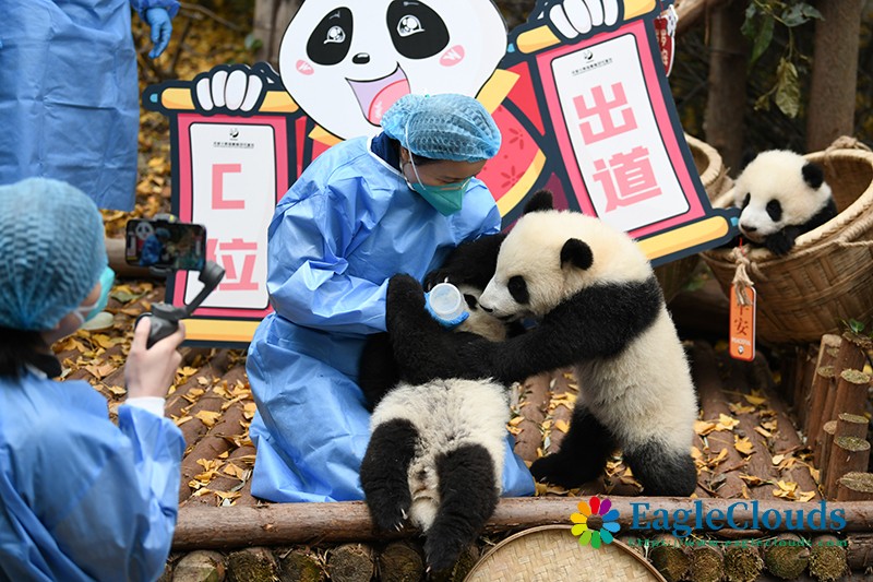 12月29日,成都大熊猫繁育研究基地工作人员抱着大熊猫宝宝亮相新年活动。