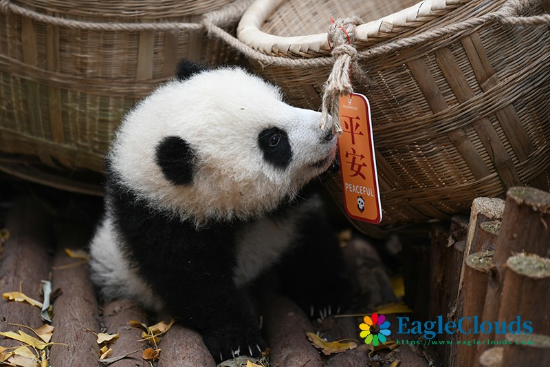 12月29日,成都大熊猫繁育研究基地工作人员在新年活动上为大熊猫宝宝拍照。