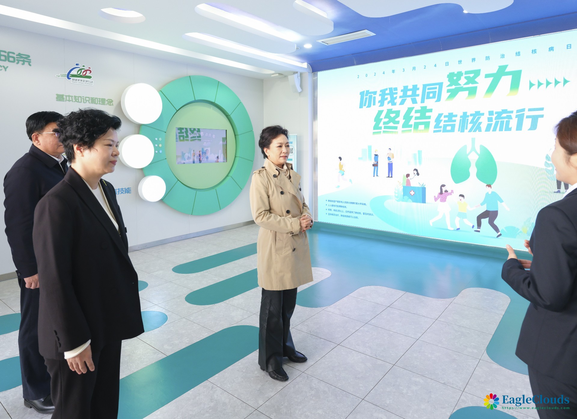 彭丽媛一行首先来到雨花区健康教育馆,听取当地开展健康知识宣教等情况介绍,了解当地结核病防治体制机制建设等情况,号召大家一起做宣传员、志愿者,在社区居民和青少年中更好普及结核病防治知识。