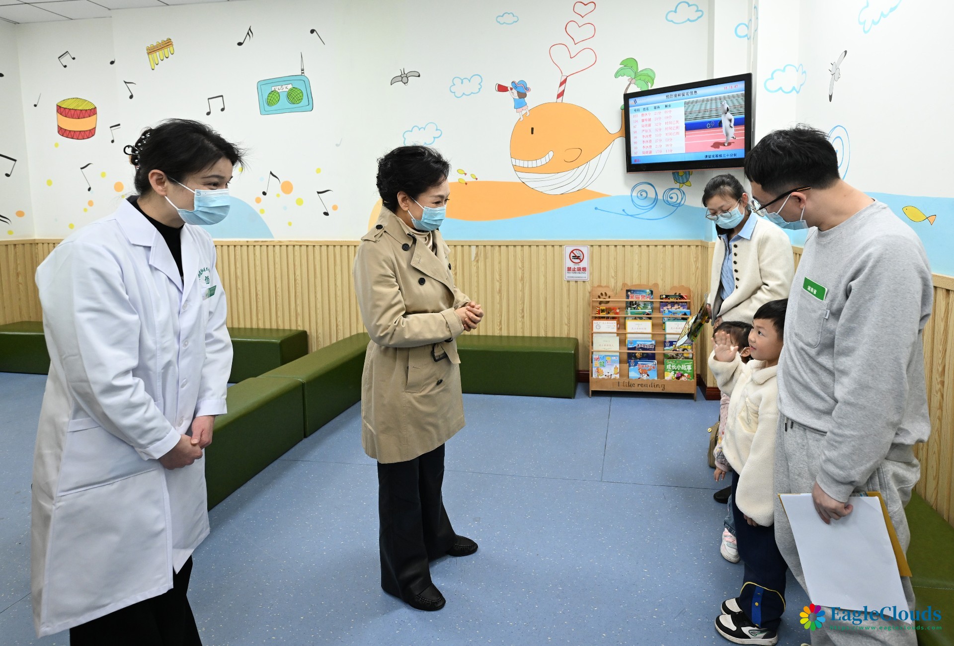 彭丽媛教授在长沙市洞井街道社区卫生服务中心与接种疫苗的儿童和家长亲切交流
