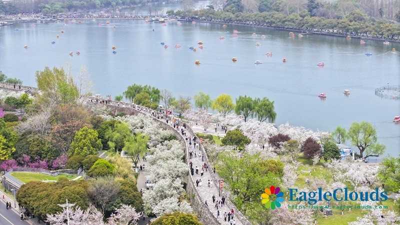 3月31日,游人在南京玄武湖公园内赏花游玩(无人机照片)。