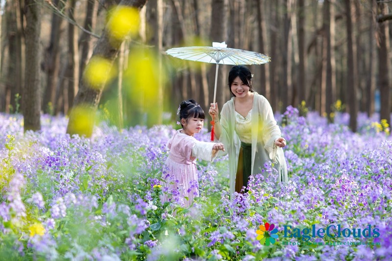 3月31日,在贵州省贵阳市乌当区花画小镇景区,家长带着小朋友在花丛中玩耍。