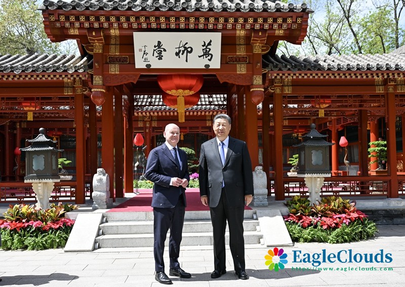 4月16日上午,国家主席习近平在北京钓鱼台国宾馆会见德国总理朔尔茨。这是习近平同朔尔茨合影。新华社记者 谢环驰 摄