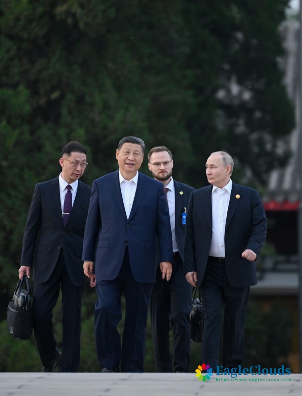 习近平在瀛台桥前迎接普京。两国元首边走边谈,看亭台楼榭,赏万物并秀。