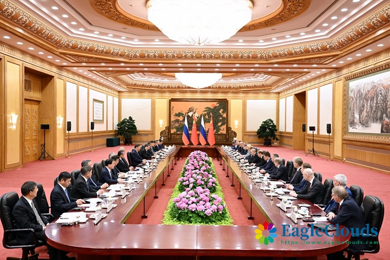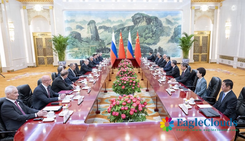 普京表示,我很高兴在就任新一届俄罗斯总统后再次访华。去年3月习近平主席也在连任后不久即对俄进行国事访问。这是我们两国的友好传统,表明双方对加强新时代俄中全面战略协作伙伴关系的高度重视。今年是中华人民共和国成立75周年,也是俄中建交75周年,值得我们共同庆祝。发展俄中关系不是权宜之计,不针对第三方,有利于国际战略稳定。俄方愿同中方持续扩大双边合作,密切在联合国、金砖国家、上海合作组织等框架内沟通协作,推动建立更加公正合理的国际秩序。