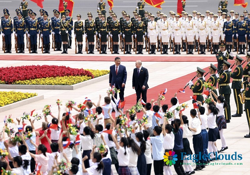 5月16日上午,国家主席习近平在北京人民大会堂同来华进行国事访问的俄罗斯总统普京举行会谈。这是会谈前,习近平在人民大会堂东门外广场为普京举行隆重欢迎仪式。新华社记者 饶爱民 摄