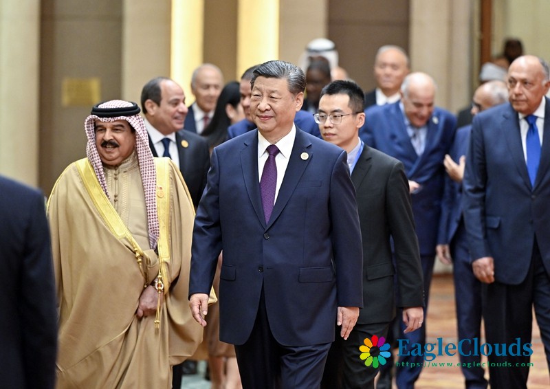 习近平同巴林国王哈马德、埃及总统塞西、突尼斯总统赛义德、阿联酋总统穆罕默德、阿盟秘书长盖特以及22位阿拉伯国家代表团团长一一握手并集体合影。
